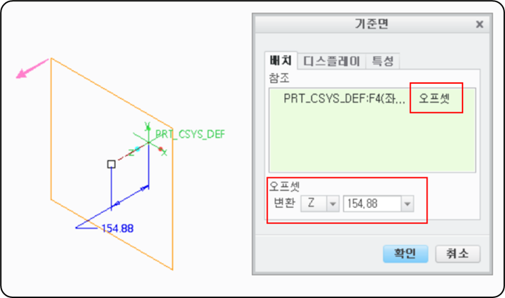 2. 참조 좌표계 선택 "오프셋"으로 일정 거리 만큼 이동된 평면 만들기