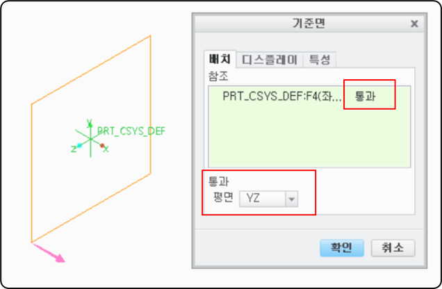 3. 참조 좌표계 선택 "통과"를 선택하면 XY,YZ,XZ 방향으로 평면을 만들수 있습니다.