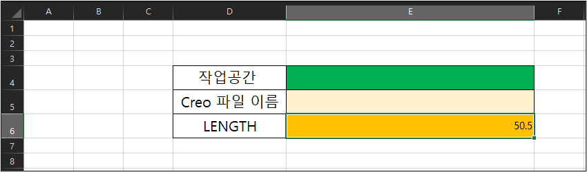 엑셀의 폴더 및 CREO 파일 이름을 입력합니다. 작업 공간의 입력 창 주소는 cells (4, "E") 이고,