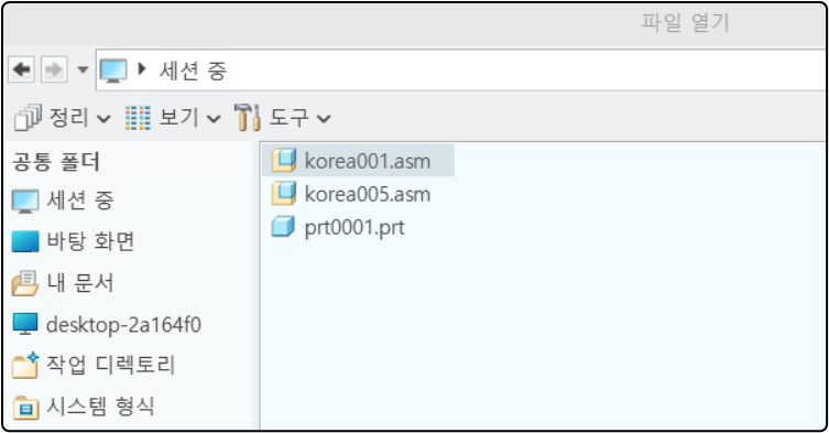다음과 같은 순서로 파일을 Open 합니다. 설명자 정의 -> 세션으로 불러오기 -> Creo 창에 보이기
