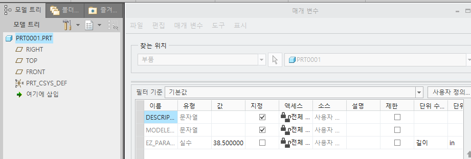 Creo 파일의 매개변수에서 "LENGTH" 매개 변수를 검색하고 값 50.5로 변경 합니다. 다음과 같은 동작 순서가
