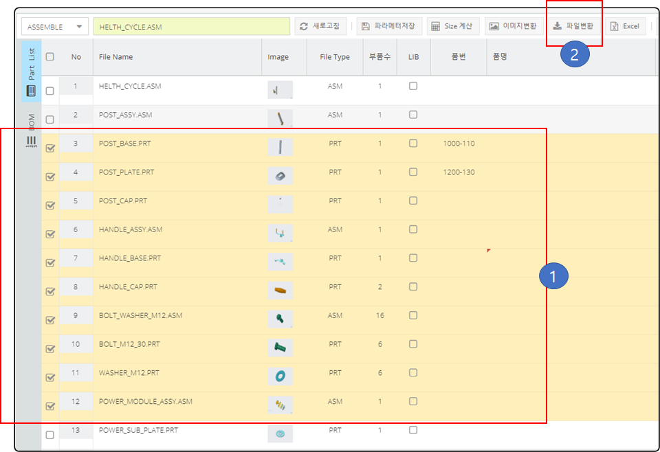 Part List 프로그램에서 CREO 파일을 선택 합니다. 파일을 선택 하면 "체크"가 표시 됩니다. "파일 변환"을 클릭 합니다