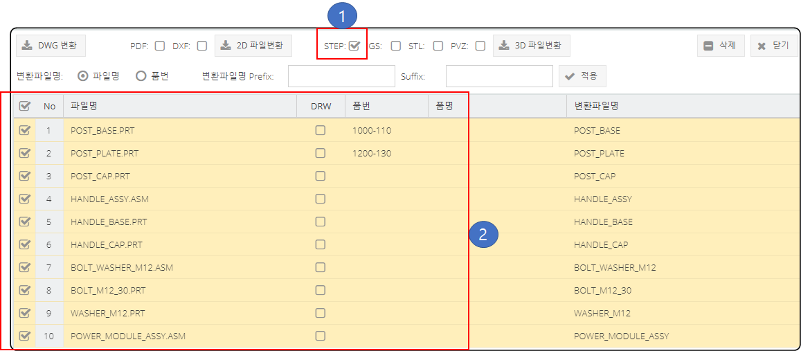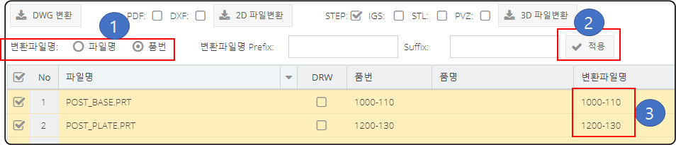 만일 품번으로 표시된 STEP 파일을 생성하려면 파일 리스트에서 CREO 모델을 선택 하고, 변환 파일면 옵션에서 "품번"을 선택 합니다. "적용" 클릭합니다. 파일명이 변경된것을 확인 할수 있습니다