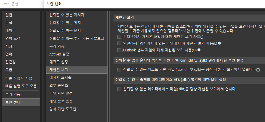 File > Option > 보안센터 > 제한된 보기
