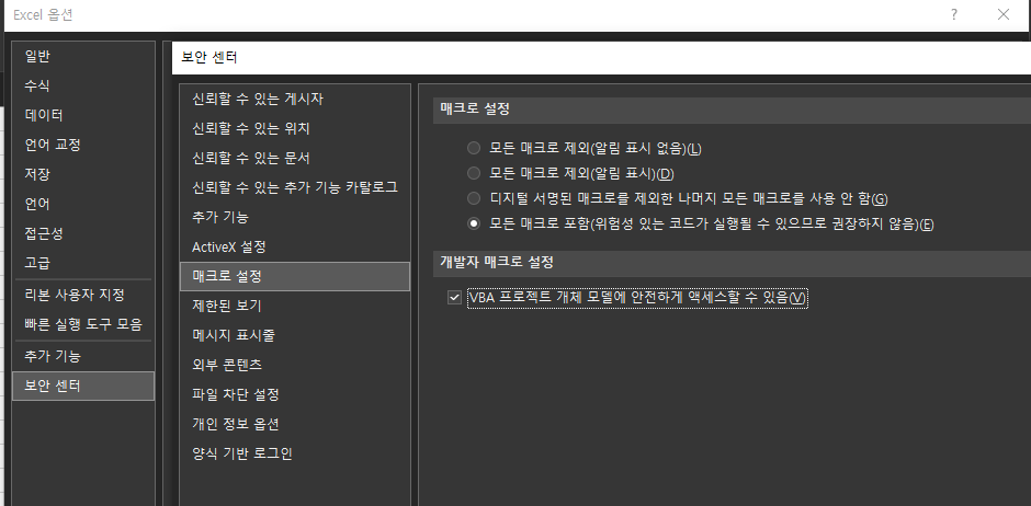 File > Option > 보안센터 > 매크로 설정