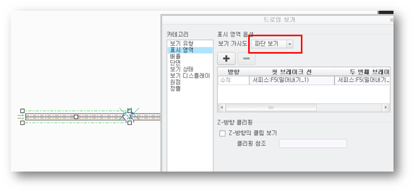 표시 영역 > 보기 가시도 > 파단 보기를 선택 하여 파단 뷰를 새성 합니다