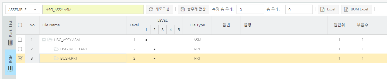 PART LIST, BOM 프로그램에서 단순화 표현을 선택 합니다"HSG_ASSY.asm" 파일만 표시 됩니다.