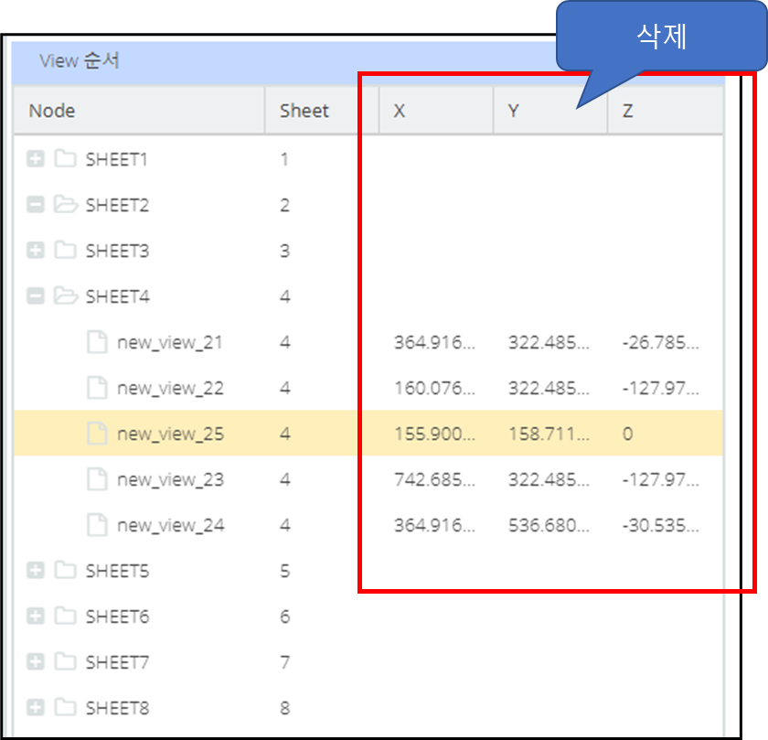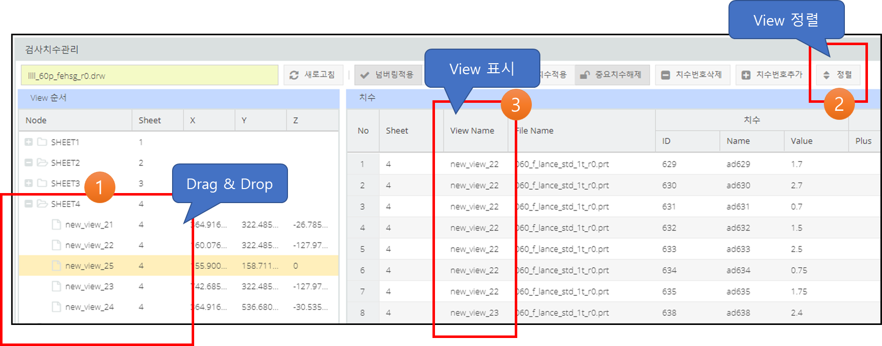 - 도면 넘버링 순서를 정의 하기 위해 view 순서를 정렬. View를 Drag & Drop 기능으로 View 순서를 이동