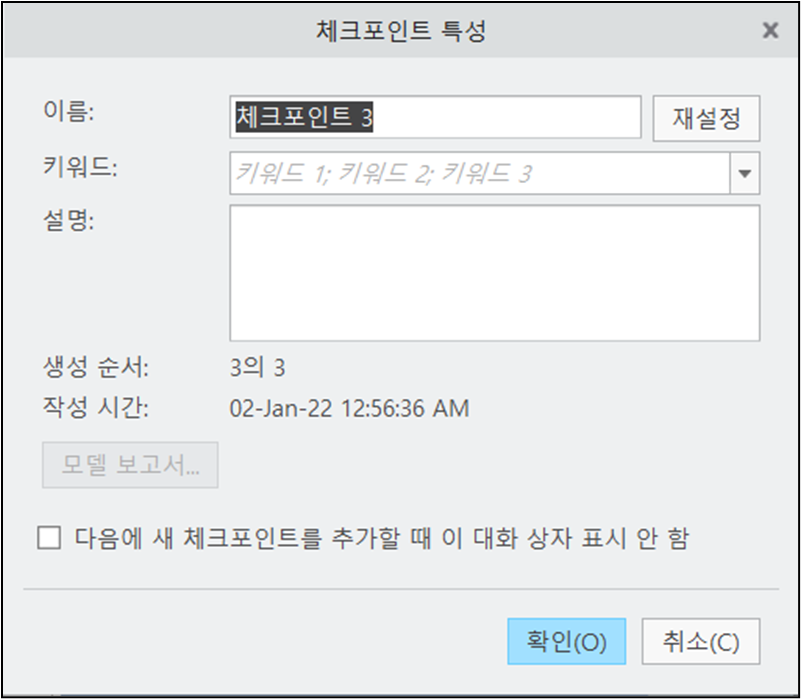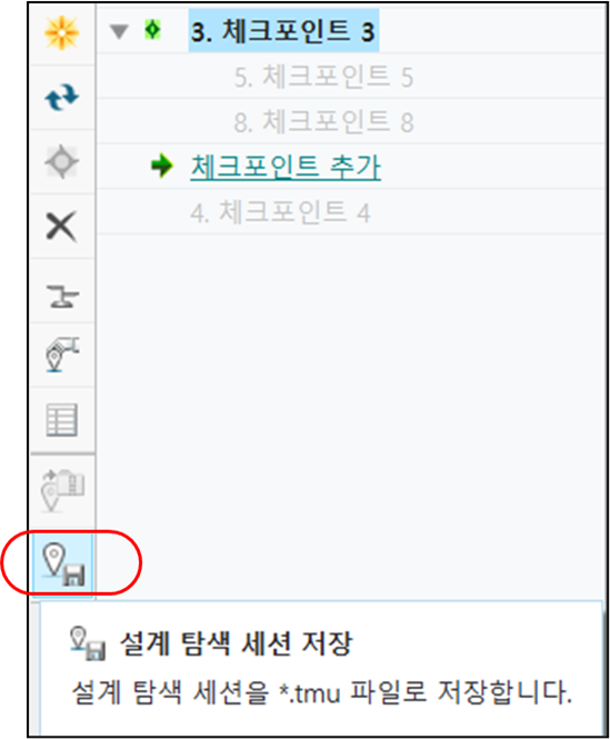 설계 탐색 세션의 모든 모델 변경 사항이 하나의 체크포인트에 저장됩니다. 어떤 유형이든 저장(Save) 명령을 사용하면 새 체크포인트가 추가됩니다.