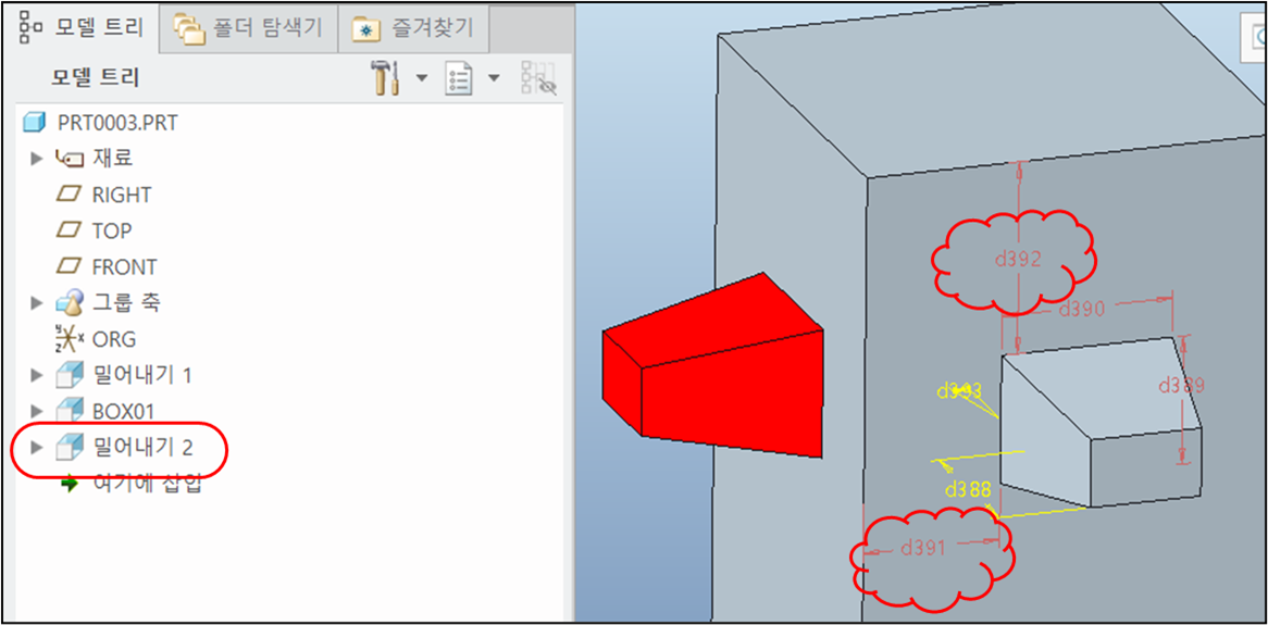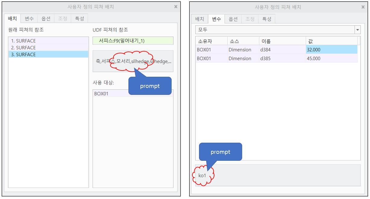UDF를 삽입하면 첫번째는 Feature 이름은 동일 합니다. 하지만 치수 이름은 Creo에서 자동으로 변경 합니다.