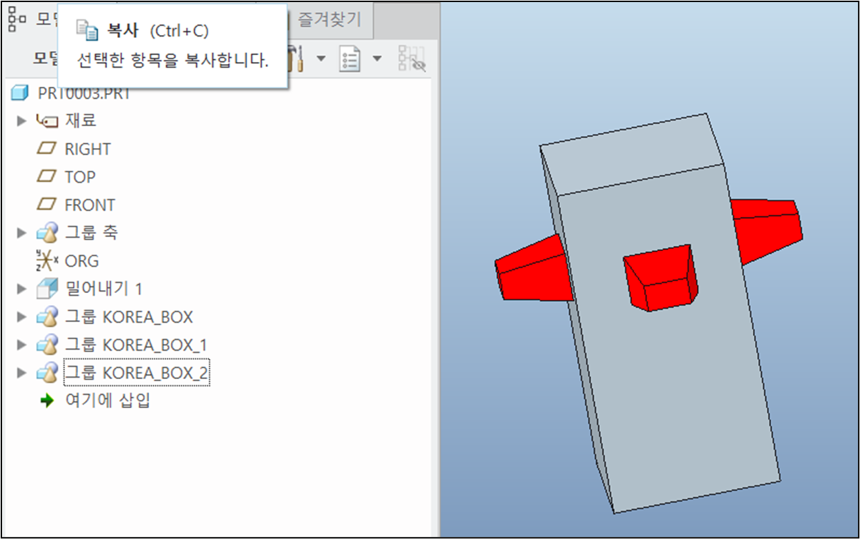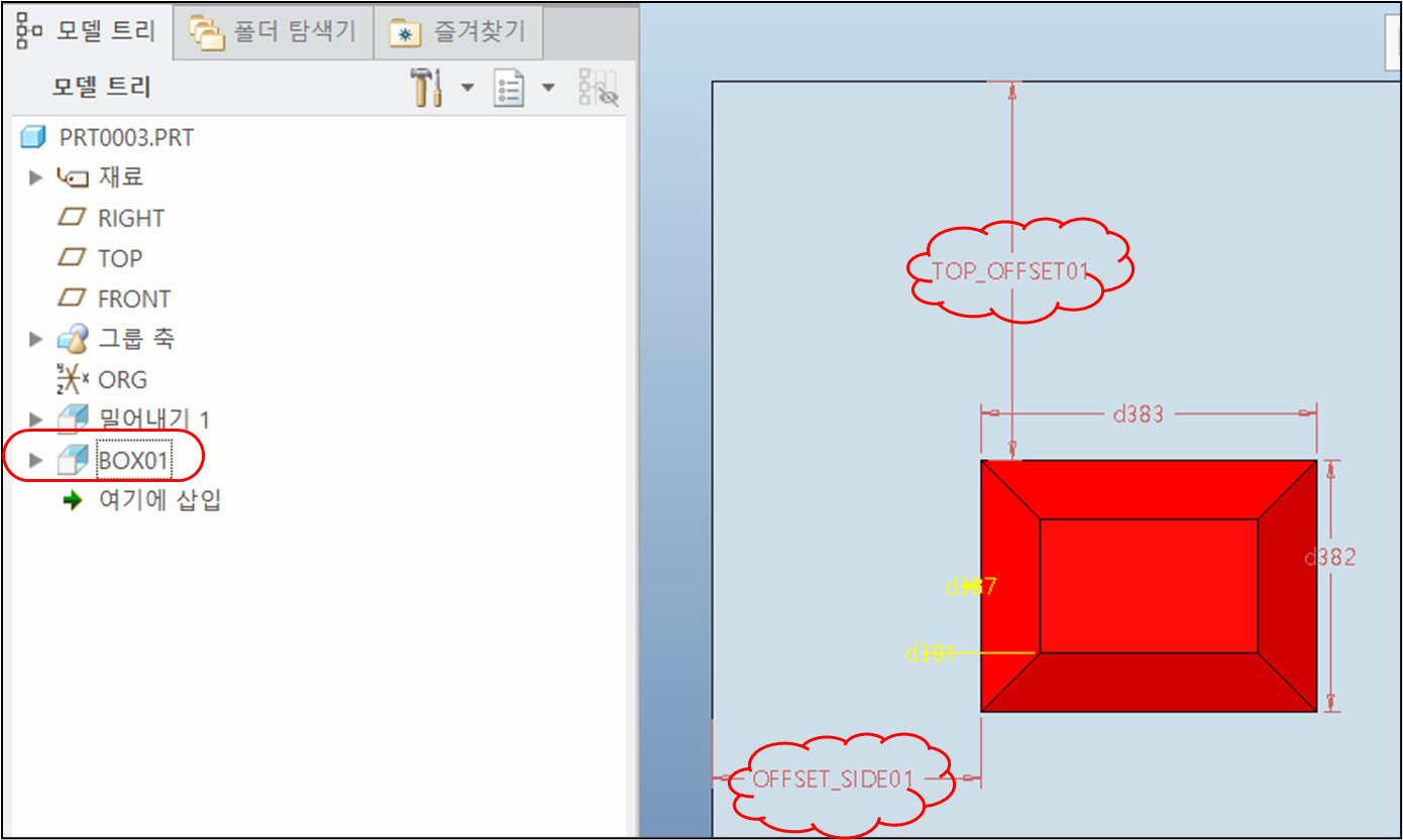 이름이 "BOX01"인 Feature를 복사 합니다. Feature의 치수 일부는 "이름"이 있습니다.