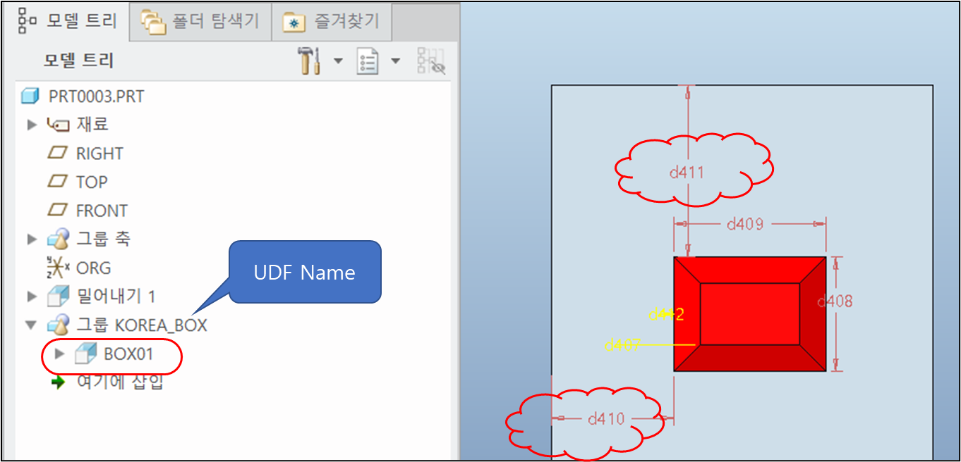 그러나 추가로 삽입 하는 UDF의 Feature , 치수 이름은 Creo에서 자동으로 변경 합니다. 프로그램으로 알수 있는 방법이 없습니다. 하지만 그룹의 이름은 UDF 파일의 이름과 연계되어 있습니다. 만일 UDF의 원본 파일에 색상이 저장 되어 있다면. 색상도 같이 삽입됩니다