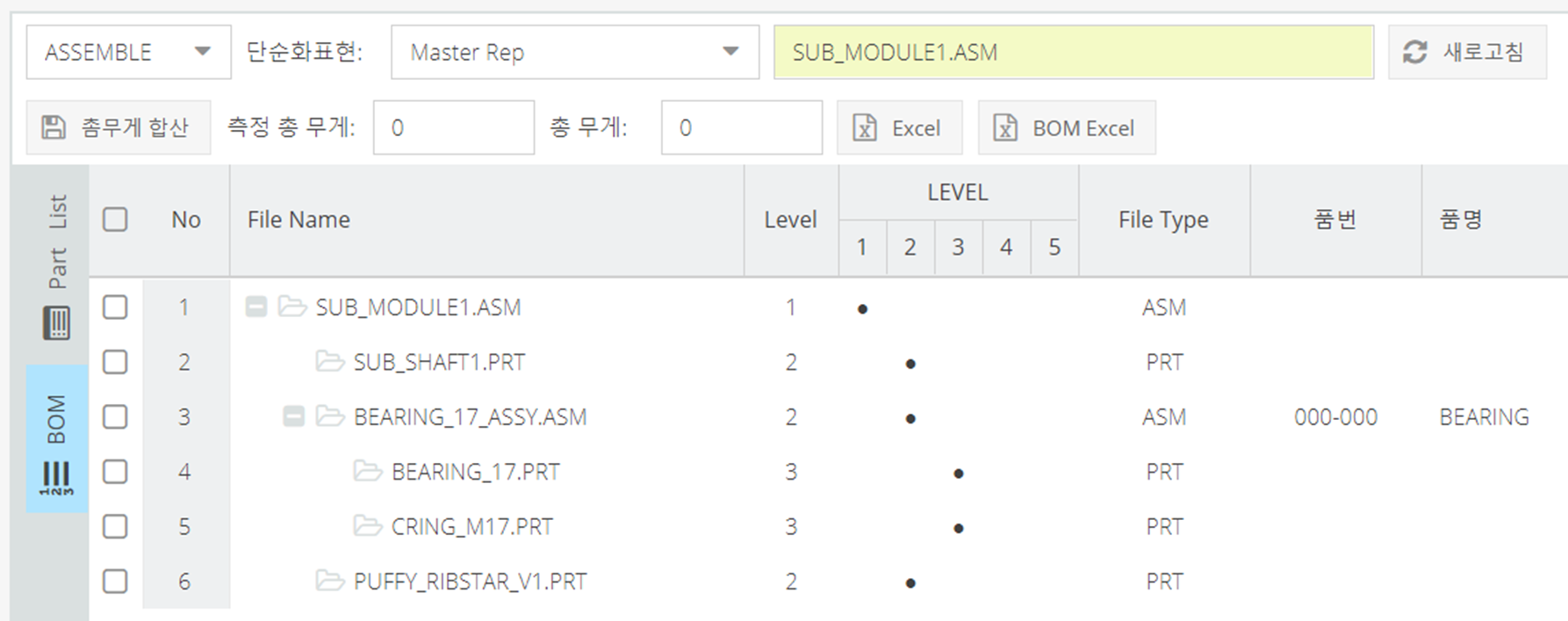 - Part List에서 읽은 어셈블 파일을 레벨 구조를 표시 합니다.