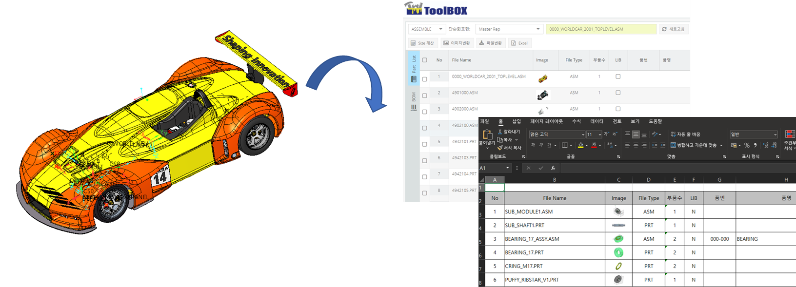 - Part List로 읽은 모델은 이미지와 함께 파일 이름, 수량, 매개변수들이 자동으로 엑셀 파일로 변환 됩니다.