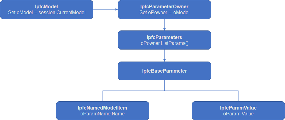 Set oParams = oPowner.ListParams() 중 "oPowner.ListParams()" 의미는 무얼까? "oPowner"는 "IpfcparameterOwner" 객체 타입니다. 즉 "ListParams() " 함수를 사용 할수 있고. "Set oPowner = oModel" 에서 현재 모델이 대입 되어 있다.