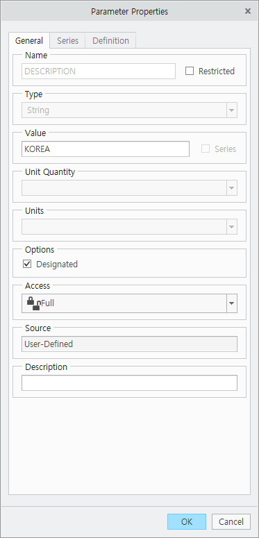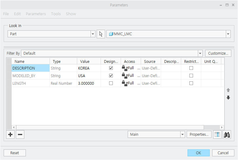 2 단계 : CREO의 파일의 Parameter 이름, 값, 타입을 표시 합니다. 모델이 가지고 있는 Paramter를 List (배열) 형식으로