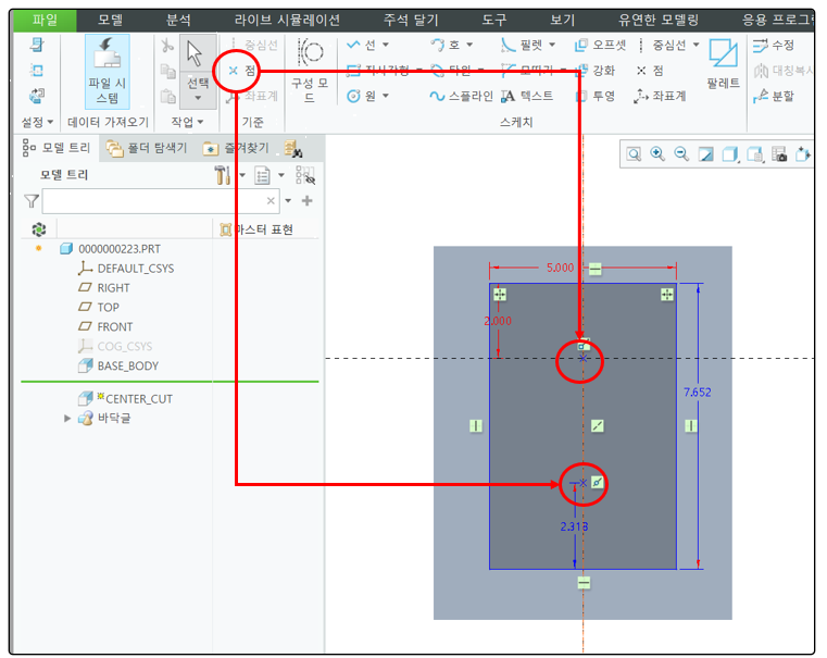 3. cut 명령의 스케치 모드에서 "포인트"를 추가 합니다