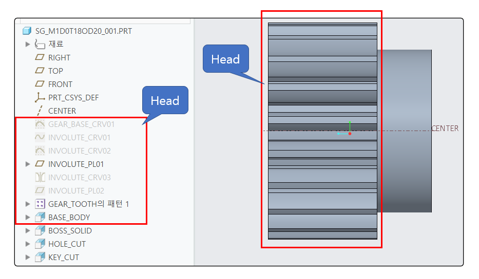 Spur Gear Template 모델은 Head 부분과 Boss 부분으로 구분되며, Feature들의 이름을 구분 하기 쉽게 정의 하였습니다