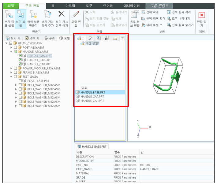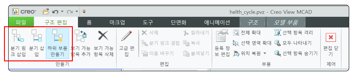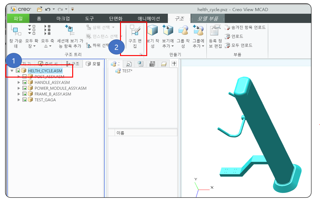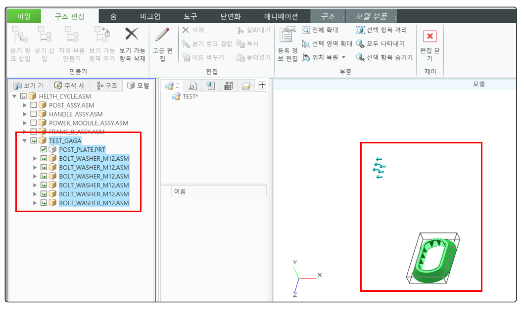 모델 TREE에서 어셈블 이름을 클릭 > 구조 > 구조 편집 버튼 클릭을 합니다. 자동으로 편집 메뉴가 실행 됩니다.