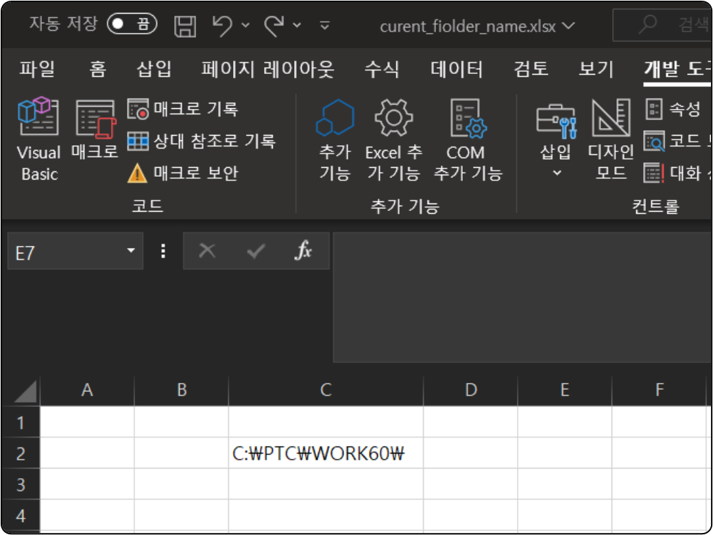 현재 설정된 작업 디렉토리의 Path와 폴더 이름을 표시합니다.변수 "workpath"에 Path와 폴더 이름을 넣습니다. 엑셀 Cel "C2"에 표시 됩니다.