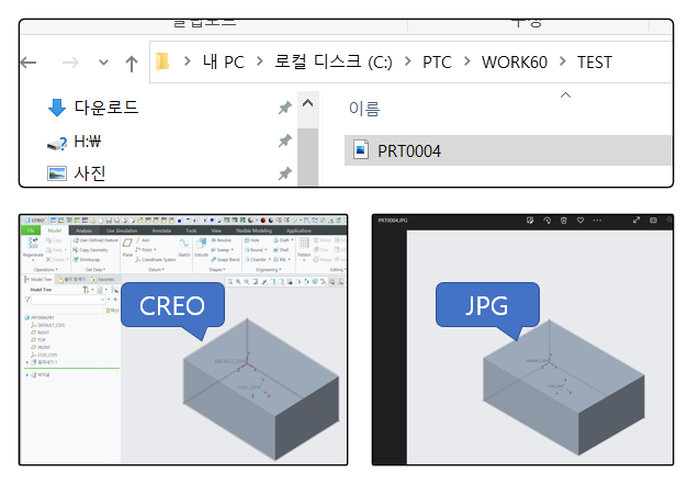 표준 Creo Parametric 래스터 출력 파일(현재 Window 화면)을 출력합니다. Session 기준이 아닌 Window 기준으로 모델을 이미지로 저장 합니다.