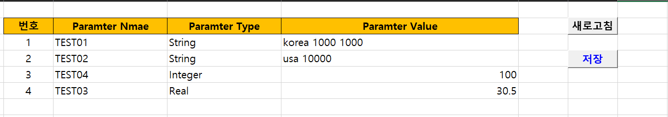 엑셀에서 매개변수 값을 변경하고 "저장" 버튼을 클릭하면, 해당 하는 매개변수 값을 모델에 저장 합니다.