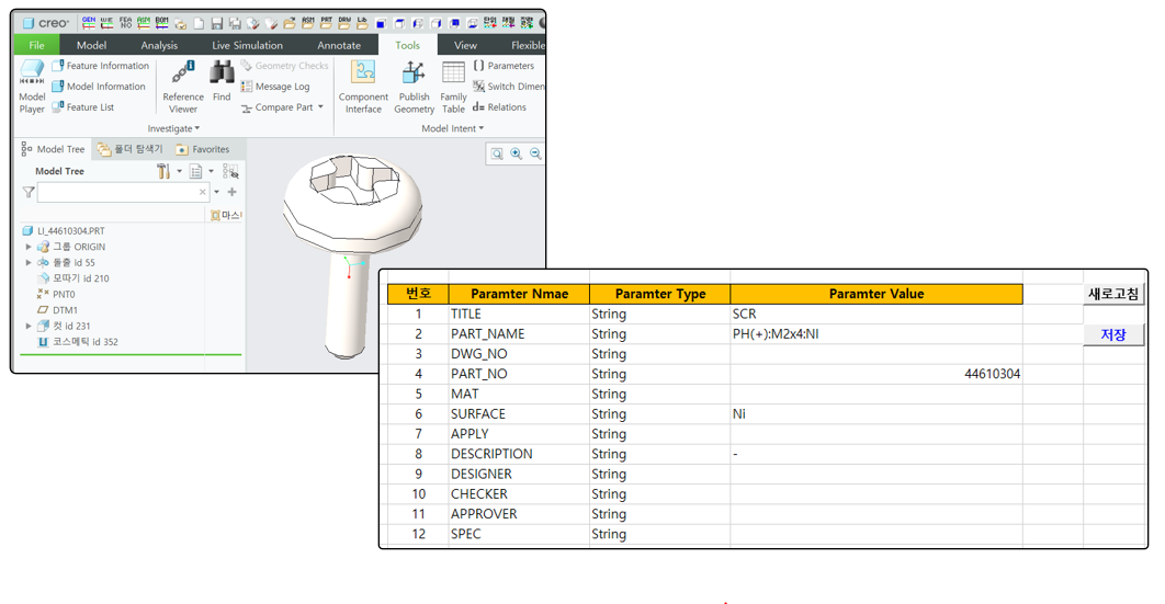 사용자가 Parameter 값을 변경 하면, 저장 버튼을 클릭하여 Creo Parameter 값을 변경 합니다.