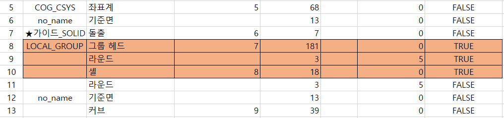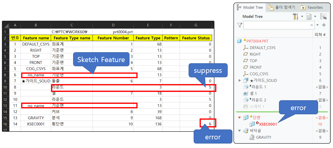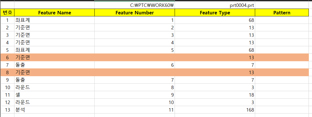 Part 모드에서 Feature의 이름과 ID, 순서 번호, Type을 검색 합니다.