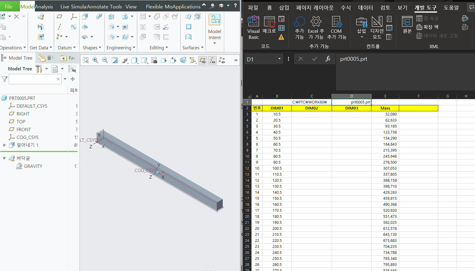 모델의 치수 값을 자동으로 변경 하여, 무게 측정 Feature의 Mass 값 가져오는 프로그램 입니다.