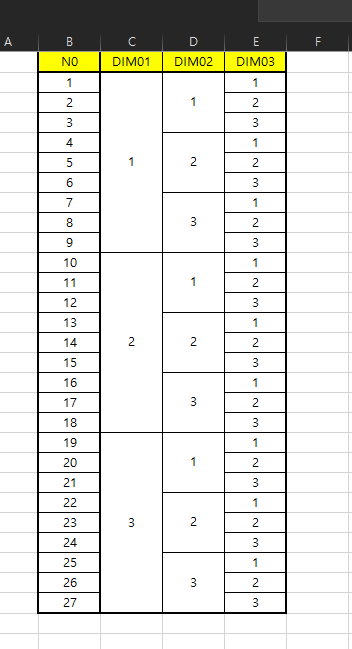 아래 그림과 같이 DIM01의 값이 1,2,3을 가지고, DIM02의 값이 1,2,3을 가지고, DIM03의 값이 1,2,3을 가진다면, 변수들을 조합하여 나올수 있는 경우의 수는 모두 27개 입니다. 1,1,1 / 1,1,2 / . . . . . .