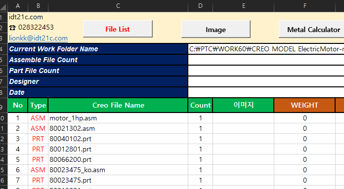 Parameter 이름은 일부 변경 및 추가 가능 합니다. "PART_NO", "PART_NAME"는 String 타입 입니다. 이름 변경이 가능 합니다. "WEIGHT", "MATERIAL"은 변경이 불가능 합니다. PART_NAME 이후에 Parameter 이름은 추가 가능 합니다. String 타입으로 저장 됩니다. Parameter 이름은 추가는 "File List"를 클릭하면 추가 됩니다.