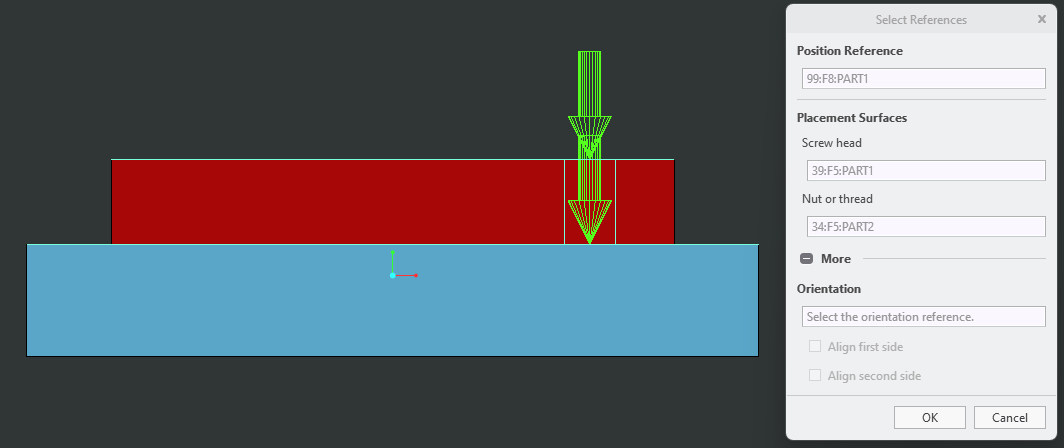 2) 새 스크류 파스너를 배치할 위치에 두개의 평면을 선택 합니다. (화살표 위치 평면 선)