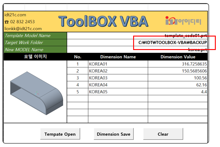 - Template 모델 (3D / 2D)을 Rename를 하고, Rename한 모델의 치수 값을 표시 합니다.