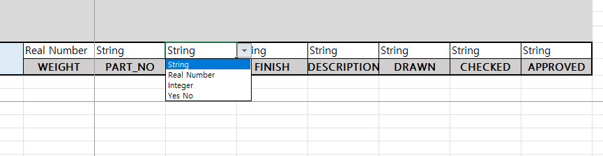 WEIGHT, PART_NO, FINISH . . . 등은 매개변수 입니다. 매개변수 이름은 변경 가능 합니다. 매개변수 이름은 추가 할수 있습니다. String, Real Number . . . . 등은 매개변수 타입입니다. 사용자가 선택 할 수 있습니다.