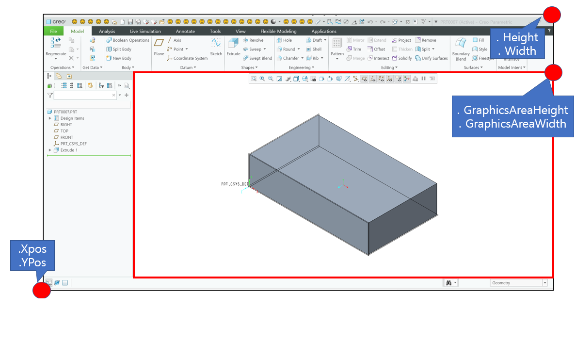 IpfcWindow.GraphicsAreaHeight 및 IpfcWindow.GraphicsAreaWidth 속성 은 테두리가 없는 Creo Parametric 그래픽 영역 창의 높이와 너비를 각각 검색 합니다. 이러한 매개변수의 값은 0에서 1로 정규화됩니다.