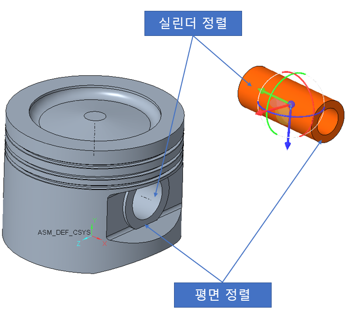 3. Piston_pin.prt 조립 : 원기둥 실린더를 정렬 시킵니다. 평면과 펼면을 정렬 시킵니다.