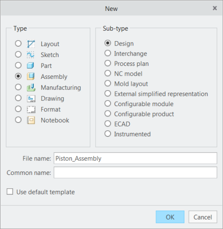 1. File > New > Assembly를 선택 하여, 파일 이름 "piston_assembly"으로 파일을 생성 합니다.