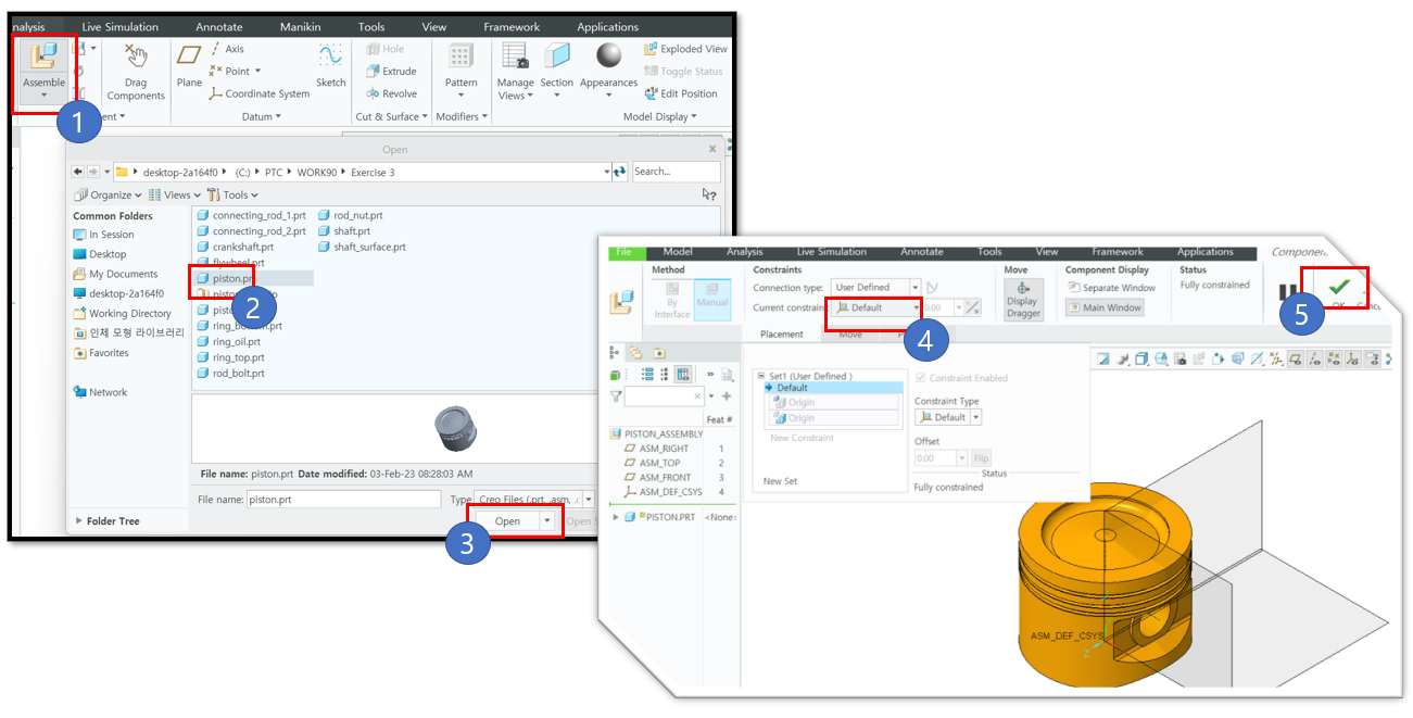 2. Assembly > Pison.prt > open : Piston Assembly 파일에 Piston 파일을 "기본 좌표계"를 일치 시켜 조립 합니다.
