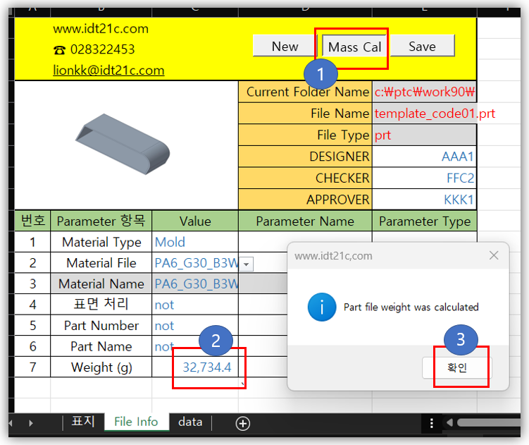 엑셀에서 선택한 재질 파일을 모델에 지정 하고, 무게를 저장 하는 프로그램 입니다. 무게의 단위는 모델의 단위를 사용 합니다.무게 기능은 재질 파일이 지정 되면, Creo에서 자동으로 계산되는