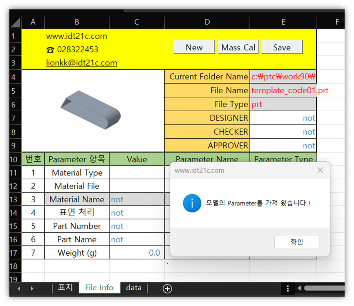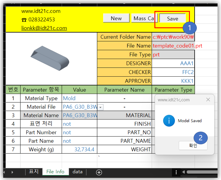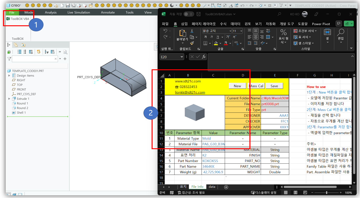 Creo 모델의 Parameter 값을 표시 하는 엑셀 VBA 프로그램 입니다. Creo 모델은 형상과 함께 Parameter 값을 가지고 있습니다. Parameter 값은 "품번", "품명", 재질 이름, 설계자 이름, 검도자 이름, 스인자 이