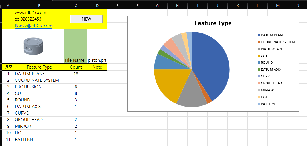 Creo Part의 Feature 타입을 엑셀 차트 기능을 이용하여, 시각화 합니다.