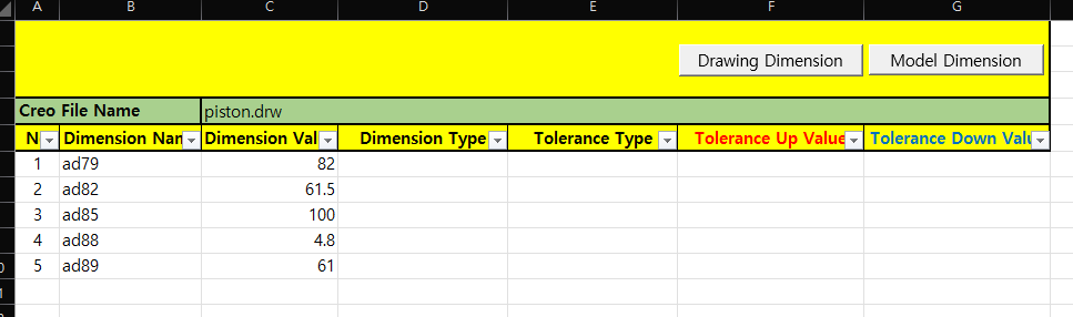 모든 치수 이름 및 값은 "IpfcBaseDimension. Symbol - 이름", "IpfcBaseDimension.DimValue - 치수 값" 으로 표시합니다.