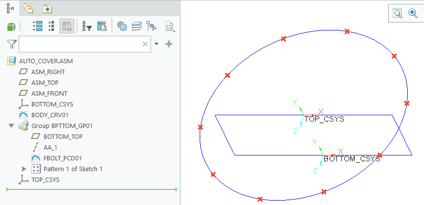 관계식은 반드시 Bottom, Top 어셈블에 저장 합니다. Total 어셈블에서 Bottom 어세블을 활성화 하고, 관계식을 정의 합니다. 조립품의 순서는 변경 해도 됩니다.