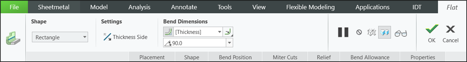 벽 대시보드에는 Shape, Offset, Relief, Bend Allowance, Bend/No Bend, Bend Radius, I/O Bend Dimension과 같은 옵션이 있습니다.