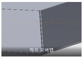 | 하프 겹침 (즉, 한 플랜지의 재료가 다른 플랜지의 중간 오버랩)은 용접 강도가 약간 약해지지만 최소한의 필러 재료를 필요로 하는 비구조용 용접 모서리의 용접 효율을 높일 수 있습니다. | ![]() |