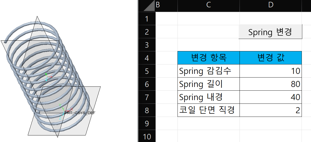 스프링 내경(SPRING_DIA) , 스프링 길이 (SPRING_LENGTH), 코일 단면 직경 (SPRING_SEC)의 치수 값을 변경 하는 코드를 추가 합니다