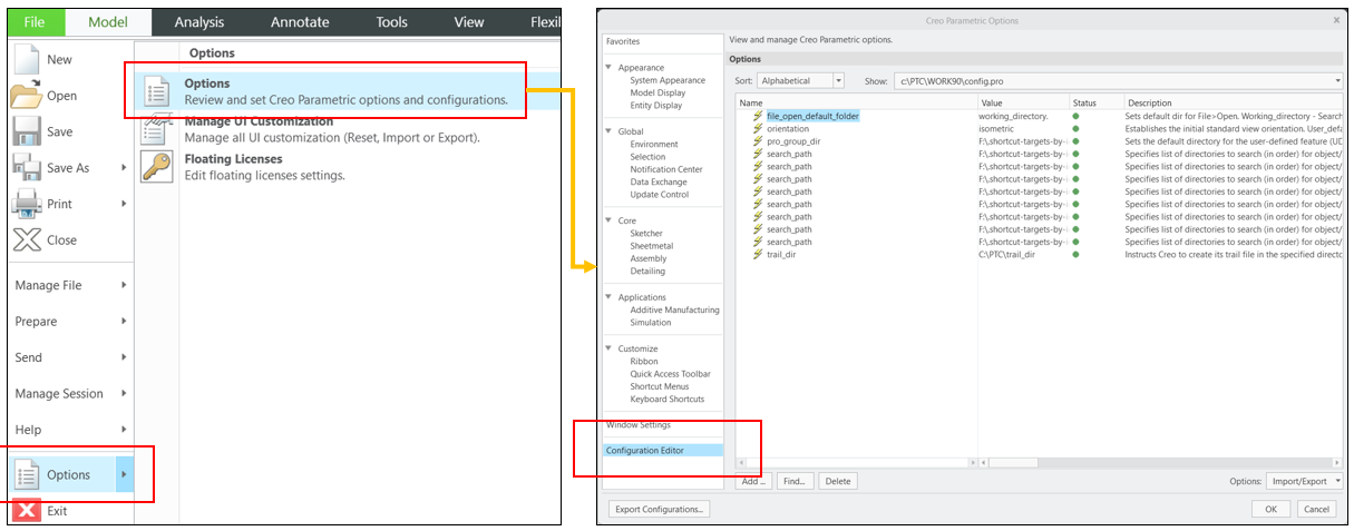 "config.pro" 파일은 텍스트 파일로서, 편집기를 사용하여 수정할 수 있습니다. 이 파일 내에서 사용자는 Creo 소프트웨어의 다양한 기능과 동작에 영향을 미치는 많은 설정을 변경할 수 있습니다. 예를 들어:
