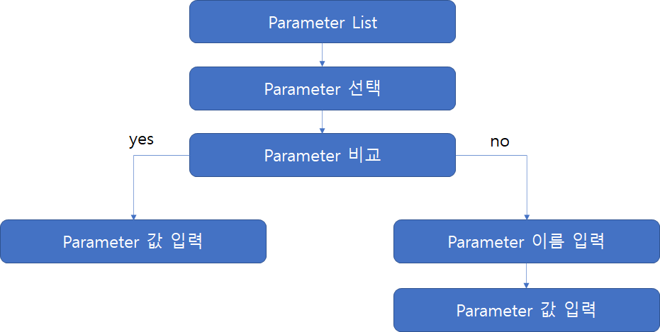 없으면 매개변수 이름을 생성 하고, 값을 입력 하는 프로그램. 다음과 같은 순서로 코딩 작업을 한다.