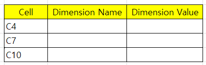 Cell의 값은 추가 또는 변경 가능 합니다. Sheet 2의 C4, C7, C10의 개수를 카운트하고, FOR 문을 이용하여 Dimension Value를 Sheet 1의 Cell 주소로 보내는 프로그램 입니다.