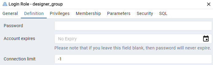 - 그룹 롤 관련: 그룹 롤은 일반적으로 로그인하지 않는 NOLOGIN 속성을 가지므로, 이 필드는 비워두는 경우가 많습니다. 하지만 로그인 가능한 롤(사용자 롤)을 만들 때는 비밀번호를 입력해야 합니다.
